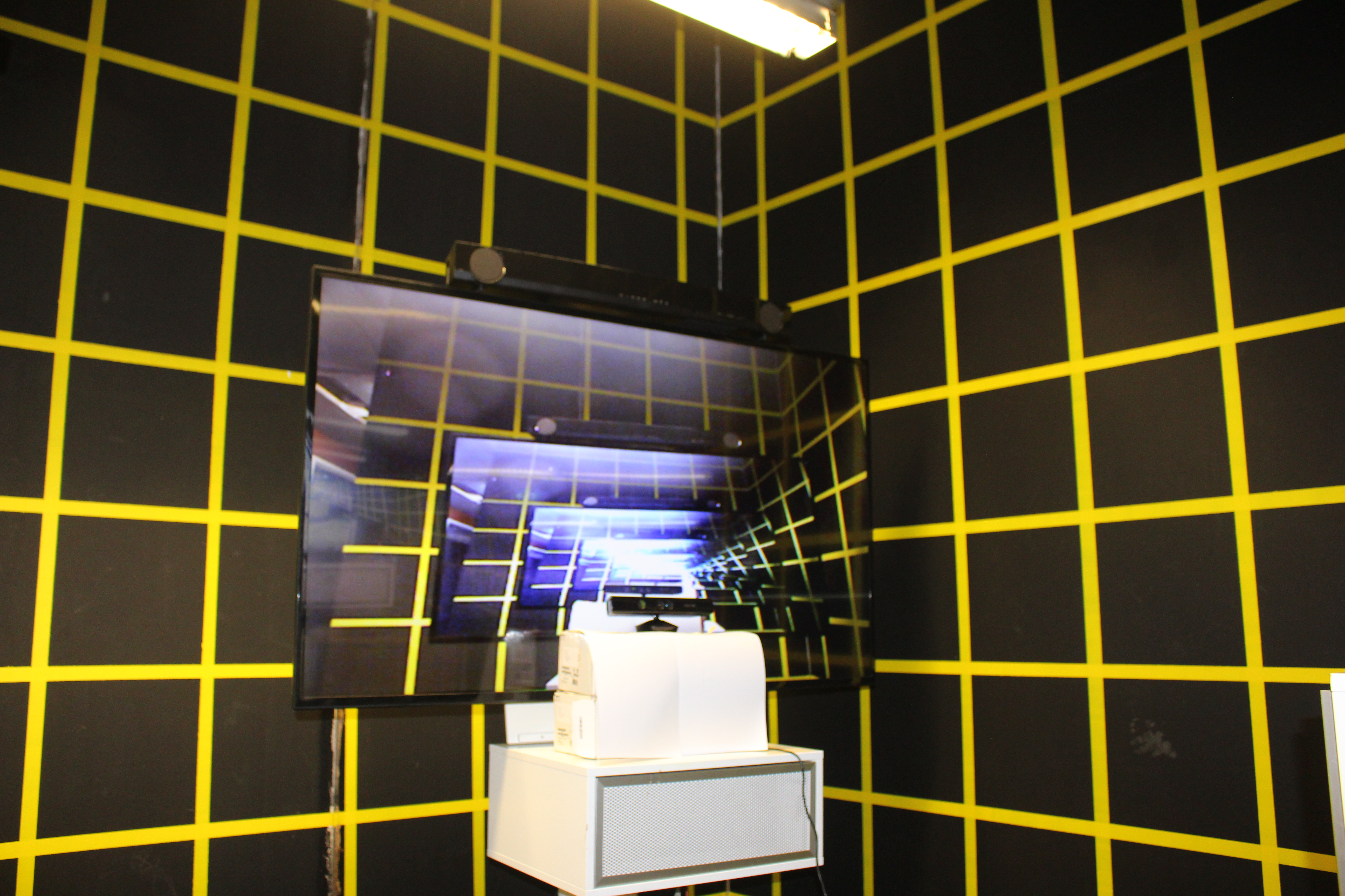 Turn Around (2018) is an interactive video installation using Kinect. When the visitor enters between the two screens a sensor is triggered and the cameras begin to record, however the visitor can never truly see their frontal profile. The work examines the relationship between our self-surveillance society and the role of the body and the camera.